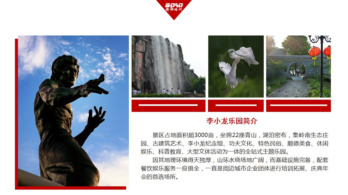 因其完備的基礎設施和優(yōu)越的環(huán)境條件,李小龍樂園一直是是各類綜合活動的最佳舉辦地:影視拍攝、慶典年會、商務會展、拓展培訓、學生郊游、民俗節(jié)慶、美食狂歡等。