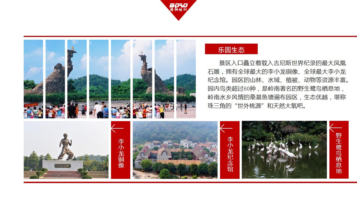 景區(qū)入口矗立著載入吉尼斯世界紀錄的最大鳳凰石雕,園區(qū)的山林、水域、植被、動物等資源豐富。園內(nèi)鳥類超過60種,是嶺南著名的野生鷺鳥棲息地,嶺南水鄉(xiāng)風情的?;~塘遍布園區(qū),生態(tài)優(yōu)越,堪稱珠三角的“世外桃源”和天然大氧吧。