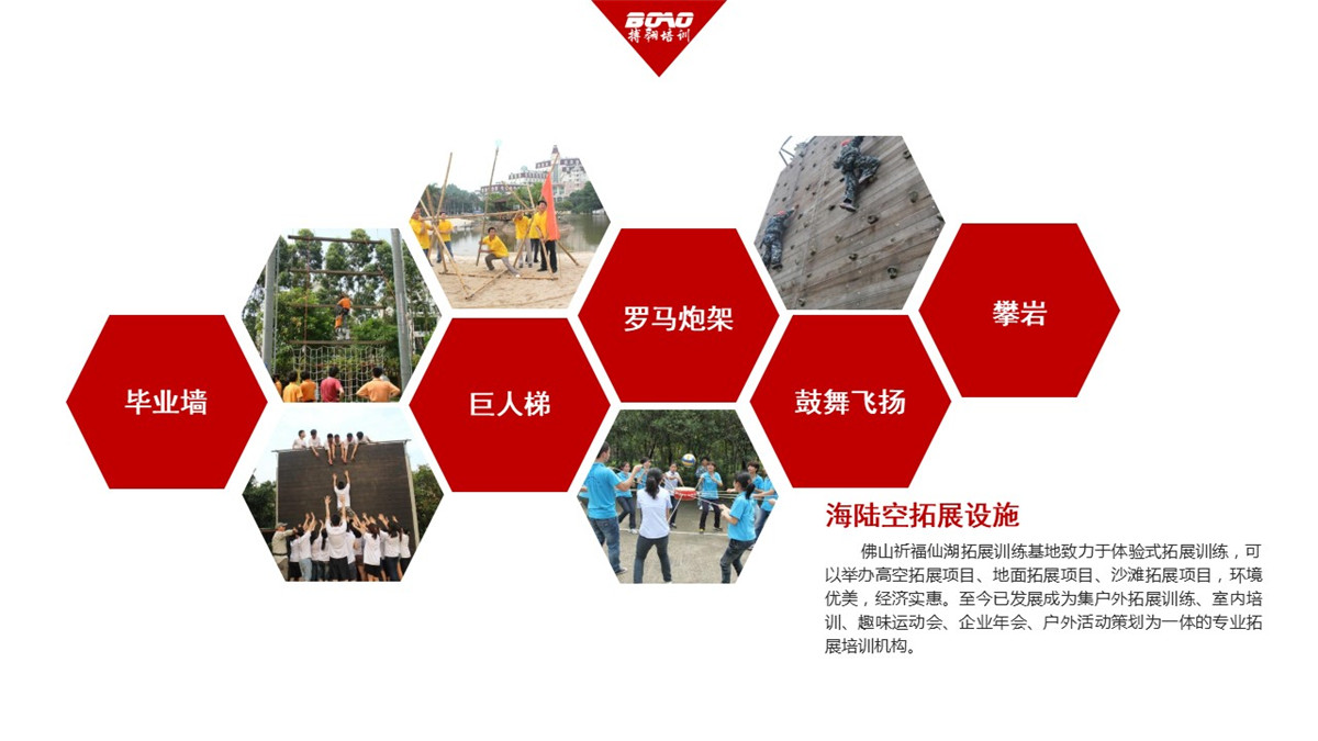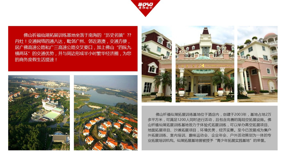 佛山祈福仙湖拓展基地 位于酒店內(nèi),創(chuàng)建于2003年,基地占地2萬多平方米,可滿足1200人同時(shí)進(jìn)行活動(dòng),且包含完善的海陸空拓展設(shè)施。佛山祈福仙湖拓展訓(xùn)練基地致力于體驗(yàn)式拓展訓(xùn)練,可以舉辦高空拓展項(xiàng)目、地面拓展項(xiàng)目、沙灘拓展項(xiàng)目,環(huán)境優(yōu)美,經(jīng)濟(jì)實(shí)惠。至今已發(fā)展成為集戶外拓展訓(xùn)練、室內(nèi)培訓(xùn)、趣味運(yùn)動(dòng)會(huì)、企業(yè)年會(huì)、戶外活動(dòng)策劃為一體的專業(yè)拓展培訓(xùn)機(jī)構(gòu)。仙湖拓展基地曾被授予“青少年拓展實(shí)踐基地”的榮譽(yù)。